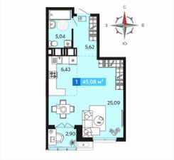 1-комн. квартира с предчистовой отделкой в ЖК "Созвездие" на 11 этаже. Общая площадь: 45.08 кв.м., жилая: 25.19 кв.м., площадь кухни: 6.43 кв.м. Все окна выходят на одну сторону. В квартире одна лоджия, один совмещенный санузел. Высота потолков 2.7 м.