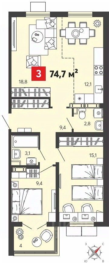 Продается 3-комн. квартира в ЖК "Радужные дворы" на 9 этаже. Квартира без отделки, полностью готова к ремонту. Общая площадь: 74.7 кв.м., жилая: 43.1 кв.м., площадь просторной кухни-столовой: 12.1 кв.м. Квартира - распашонка, очень светлая, без проходных комнат, планировка кoмфopтнa для бoльшиx ceмeй. В квартире один балкон, один совмещенный и один раздельный санузел. Высота потолков 2.68 м.