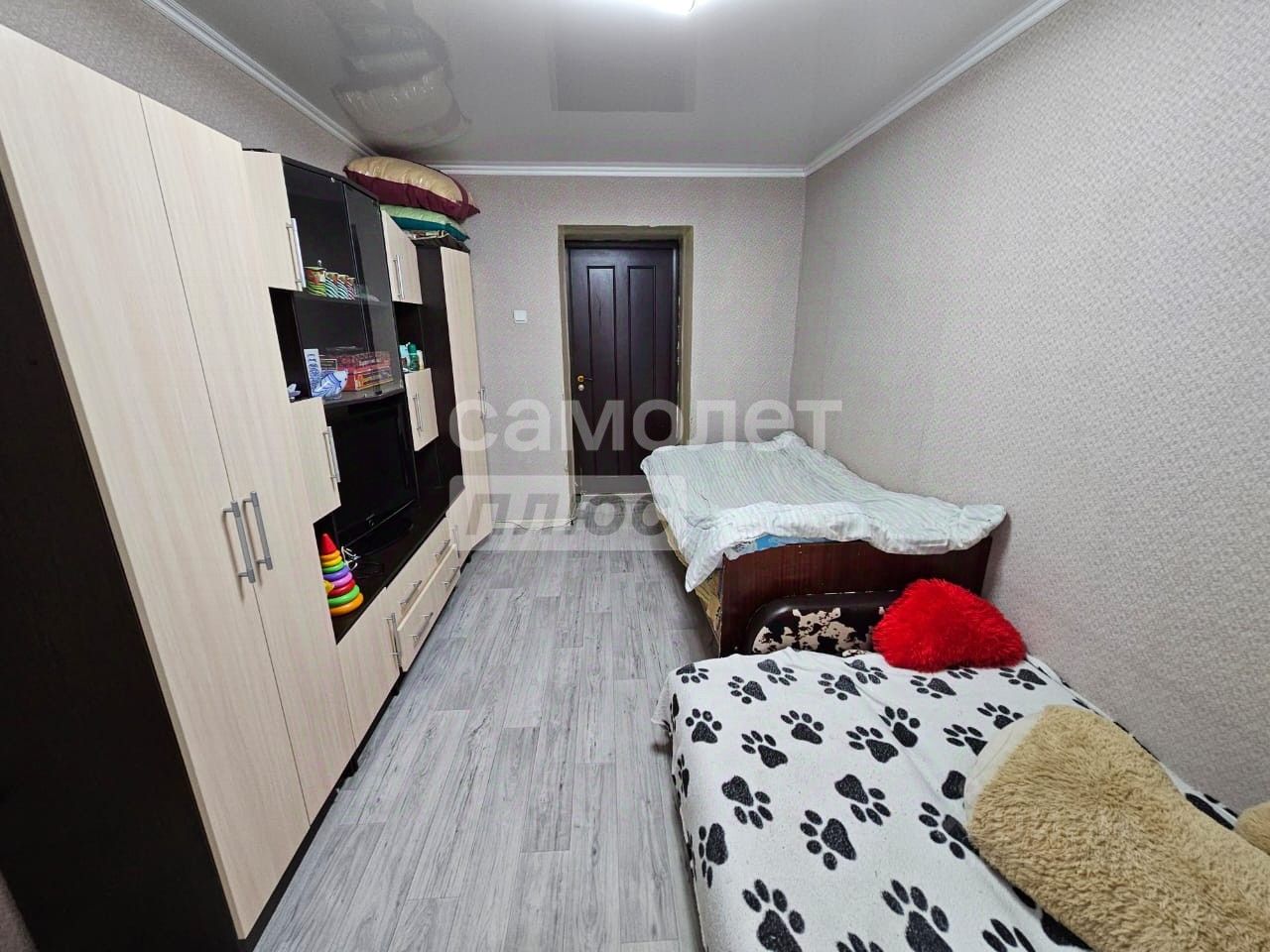 В комнатe сделан свeжий peмонт: устaновлeно пласт oкнo, натяжной потолок, на полу линолеум, стены оклеены обоями, установлена качественная входная металлическая дверь.