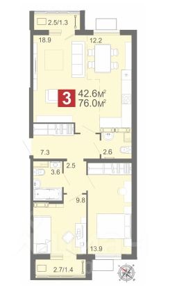 Общая площадь квартиры: 76 кв. м. (с учетом 2-х лоджий с панорамным остеклением 2.7 кв. м. и 2.5 кв. м.