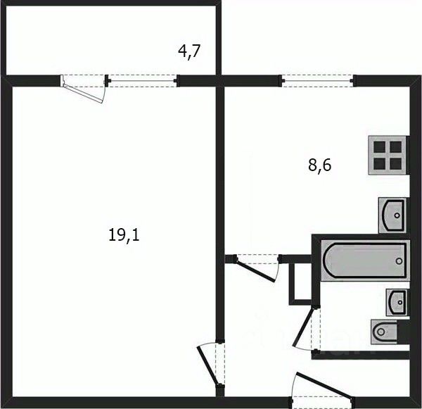 • Комфортная жилая комната 19.1 кв.м. имеет выход на лоджию, кухня 8,6 кв.м. имеет удобную квадратную форму, нишу под холодильник.