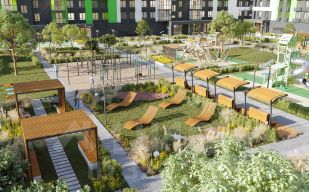 Во дворах — детские игровые комплексы, спортивные площадки, зоны с тренажерами, беседки, перголы и зоны для барбекю. На первых этажах — колясочные комнаты.