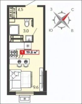 1-комн. квартира-студия с предчистовой отделкой в ЖК "Радужные дворы" на 11 этаже. Общая площадь: 19.8 кв.м., площадь гостиной 12.3 кв.м., из которых 2.7 кв.м. выделено под кухонную зону. Все окна выходят на одну сторону. В квартире один совмещенный санузел. Высота потолков 2.68 м.