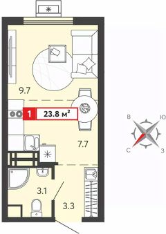 1-комн. квартира-студия с предчистовой отделкой в ЖК "Радужные дворы" на 13 этаже. Общая площадь: 23.8 кв.м., площадь гостиной 17.4 кв.м., из которых 7.7 кв.м. выделено под кухонную зону. Все окна выходят на одну сторону. В квартире один совмещенный санузел. Высота потолков 2.68 м.