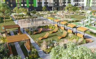 Во дворах — детские игровые комплексы, спортивные площадки, зоны с тренажерами, беседки, перголы и зоны для барбекю. На первых этажах — колясочные комнаты.