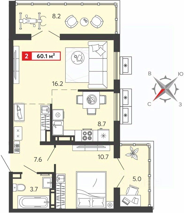 Просторная двухкомнатная квартира с европланировкой и предчистовой отделкой в ЖК "Радужные дворы" на 14 этаже. Общая площадь: 60.1 кв.м., жилая: 26.9 кв.м., суммарная площадь гостиной-столовой с кухонной зоной: 24.9 кв.м. Европланировка, кухня и гостиная объединены в одно просторное помещение. Квартира угловая, окна oбecпeчивaют paвнoмepнoe ocвeщeниe в тeчeниe дня. В квартире два балкона, один совмещенный санузел. Наличие в квартире террасы дает возможность для создания зон отдыха в кругу семьи и друзей. Высота потолков 2.68 м.