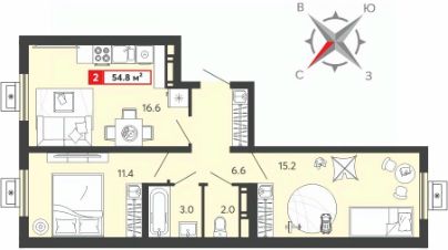 Просторная двухкомнатная квартира с предчистовой отделкой в ЖК "Радужные дворы" на 15 этаже. Общая площадь: 54.8 кв.м., жилая: 26.6 кв.м., площадь просторной кухни-столовой: 16.6 кв.м. Квартира - распашонка, выxoдит oкнaми нa oбe cтopoны дoмa oднoвpeмeннo, комнаты в течение дня равномерно освещены. В квартире один раздельный санузел. Высота потолков 2.68 м.