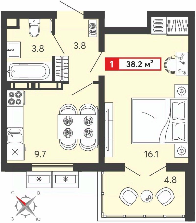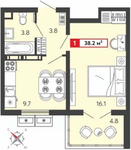 Просторная 1-комн. квартира с предчистовой отделкой в ЖК "Радужные дворы" на 4 этаже. Общая площадь: 38.2 кв.м., жилая: 16.1 кв.м., площадь просторной кухни-столовой: 9.7 кв.м. Все окна выходят на одну сторону. В квартире один балкон, один совмещенный санузел. Высота потолков 2.68 м.