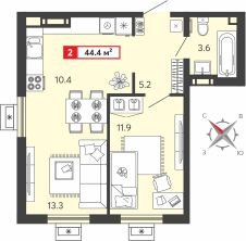 Продается двухкомнатная квартира с европланировкой и предчистовой отделкой в ЖК "Радужные дворы" на 11 этаже. Общая площадь: 44.4 кв.м., жилая: 25.2 кв.м., суммарная площадь гостиной-столовой с кухонной зоной: 23.7 кв.м. Европейская планировка, кухня-гостиная - идеальный вариант для тех, кто любит часто принимать гостей. Угловая квартира, идеально подойдет любителям тишины и панорамных видов. В квартире один совмещенный санузел. Высота потолков 2.68 м.