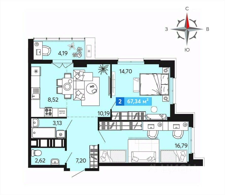 2-комн. квартира от застройщика с предчистовой отделкой в ЖК "Созвездие" на 11 этаже. Общая площадь: 67.34 кв.м., жилая: 31.49 кв.м., площадь кухни: 8.52 кв.м. Квартира угловая, идеально подойдет любителям тишины и панорамных видов. В квартире один балкон, один раздельный санузел. Высота потолков 2.7 м.