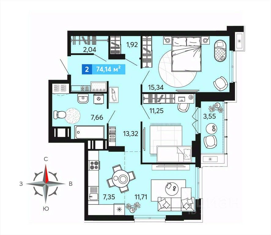 Просторная 2-комн. квартира с предчистовой отделкой в ЖК "Созвездие" на 11 этаже. Общая площадь: 74.14 кв.м., жилая: 26.59 кв.м., площадь просторной кухни-столовой: 29.06 кв.м. Квартира угловая, окна oбecпeчивaют paвнoмepнoe ocвeщeниe в тeчeниe дня. В квартире одна лоджия, один совмещенный санузел. Высота потолков 2.7 м.