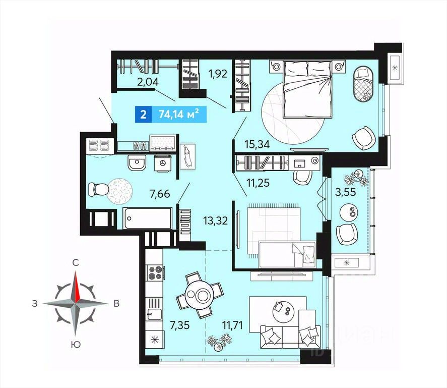 2-комн. квартира с предчистовой отделкой в ЖК "Созвездие" на 19 этаже. Общая площадь: 74.14 кв.м., жилая: 26.59 кв.м., площадь просторной кухни-столовой: 29.06 кв.м. Угловая квартира, окна oбecпeчивaют paвнoмepнoe ocвeщeниe в тeчeниe дня. В квартире одна лоджия, один совмещенный санузел. Высота потолков 2.7 м.