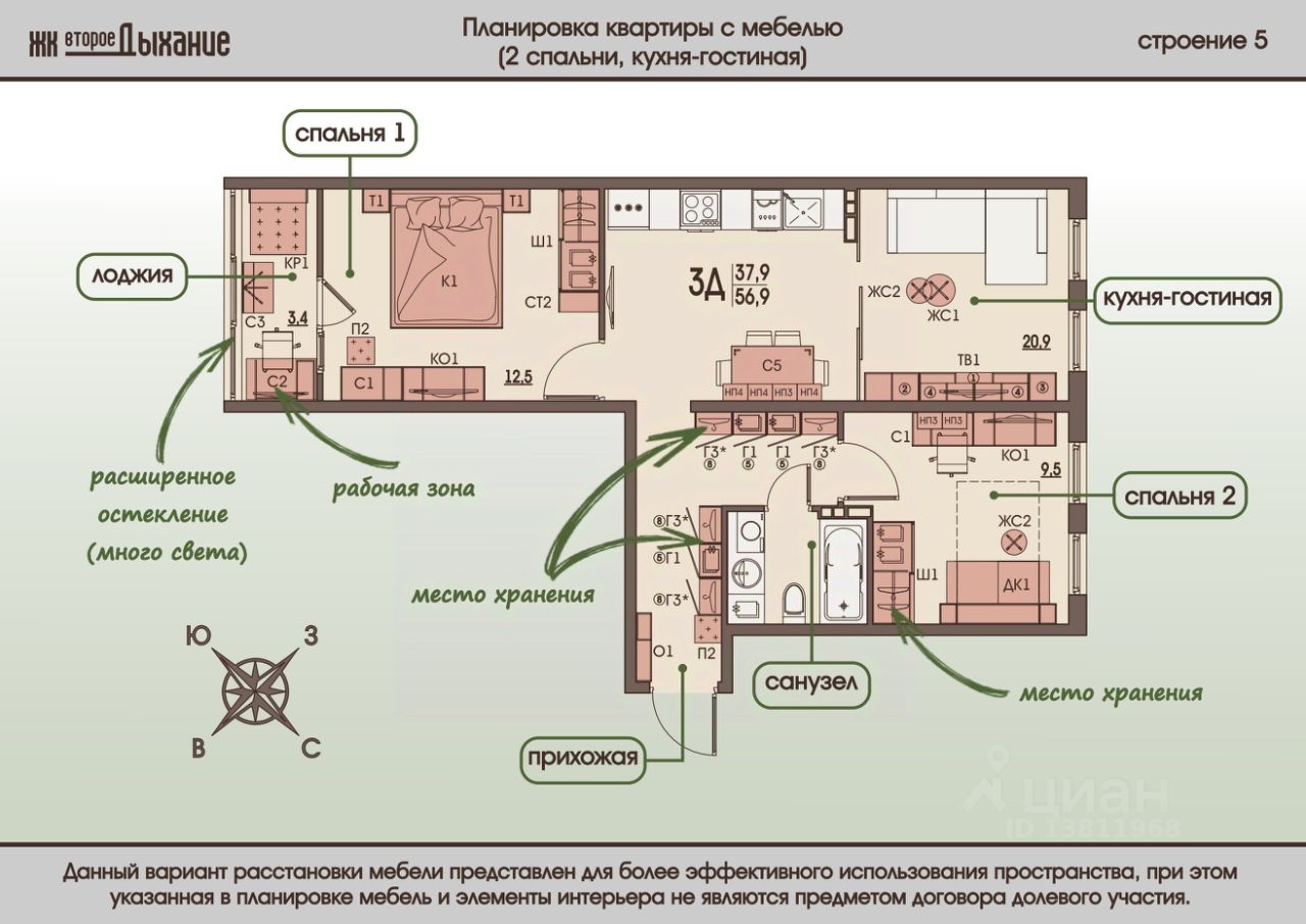 Евротрехкомнатная Квартира - "распашонка" 56,9м2. Современная планировка евро-формата, которая позволит воплотить Ваши мечты и сделать квартиру уникальной! Сердцем данной квартиры является просторная кухня гостиная 21 кв.м. и располагает к тому, чтобы вся семья собиралась по вечерам в одном месте. Изолированными остаются только спальни. Это отличное решение для семей с детьми. Если разместить игровую зону в гостиной, можно следить за ребенком, не выходя за пределы кухни. А если дети уже взрослые, большим плюсом является удалённость родительской комнаты от детской. Отдельная гардеробная комната расположенная при входе это рациональный способ решить вопрос компактного размещения вещей. Она обеспечивает сохранность предметов одежды и обуви, когда они долгое время не востребованы, а также позволяет содержать в идеальном порядке вещи, которые используются ежедневно. Окна у данной квартиры выходят на противоположные стороны дома: на дворик и улицу. Наблюдение за восходом солнца придаст дополнительные силы, а вечерний закат успокоит и поможет скоротать вечер. У данной планировки комнаты будут в течение дня равномерно освещены и хорошо проветрены. Квартира, куда хочется возвращаться, отдыхать и проводить время с родными и близкими!
