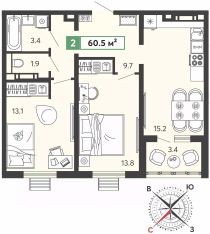 Продается 2-комн. квартира от застройщика в ЖК "Спутник" на 2 этаже. Квартира без отделки, полностью готова к чистовой отделке и дальнейшему ремонту. Общая площадь: 60.5 кв.м., жилая: 26.9 кв.м., площадь просторной кухни-столовой: 15.2 кв.м. Комнаты изолированные, все окна выходят на одну сторону. В квартире одна лоджия, один раздельный санузел. Высота потолков 2.68 м.