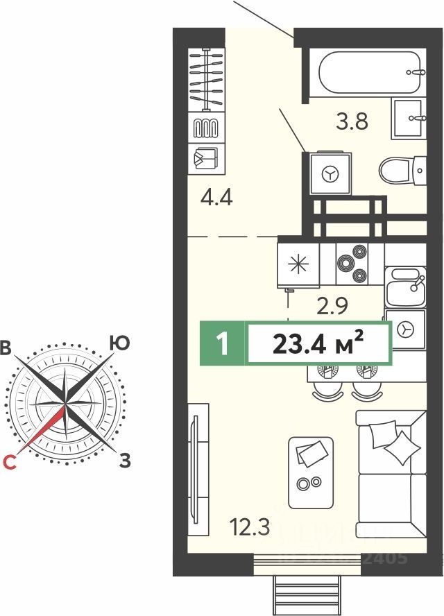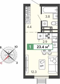 1-комн. квартира-студия в ЖК "Спутник" на 2 этаже. Квартира без отделки, полностью готова к чистовой отделке и дальнейшему ремонту. Общая площадь: 23.4 кв.м., площадь гостиной 15.2 кв.м., из которых 2.9 кв.м. выделено под кухонную зону. Все окна выходят на одну сторону. В квартире один совмещенный санузел. Высота потолков 2.68 м.
