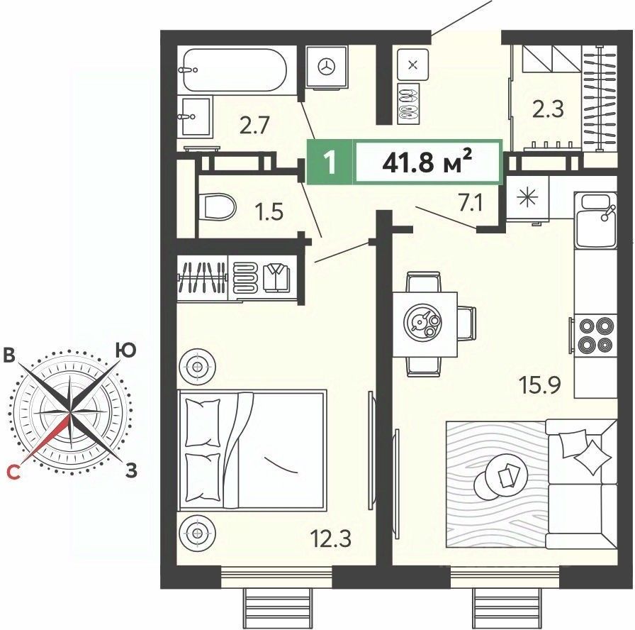 Однокомнатная квартира от застройщика в ЖК "Спутник" на 2 этаже. Квартира без отделки, полностью готова к ремонту. Общая площадь: 41.8 кв.м., жилая: 12.3 кв.м., площадь просторной кухни-столовой: 15.9 кв.м. Все окна выходят на одну сторону. В квартире один раздельный санузел. Высота потолков 2.68 м.