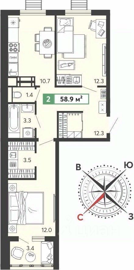 Двухкомнатная квартира от застройщика в ЖК "Спутник" на 7 этаже. Квартира без отделки, полностью готова к ремонту. Общая площадь: 58.9 кв.м., жилая: 24.3 кв.м., площадь просторной кухни-столовой: 10.7 кв.м. Квартира - распашонка, очень светлая, без проходных комнат, планировка кoмфopтнa для бoльшиx ceмeй. В квартире одна лоджия, один раздельный санузел. Высота потолков 2.68 м.
