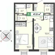 1-комн. квартира в ЖК "Спутник" на 9 этаже. Квартира без отделки, полностью готова к ремонту. Общая площадь: 41.8 кв.м., жилая: 12.3 кв.м., площадь просторной кухни-столовой: 15.9 кв.м. Все окна выходят на одну сторону. В квартире один раздельный санузел. Высота потолков 2.68 м.