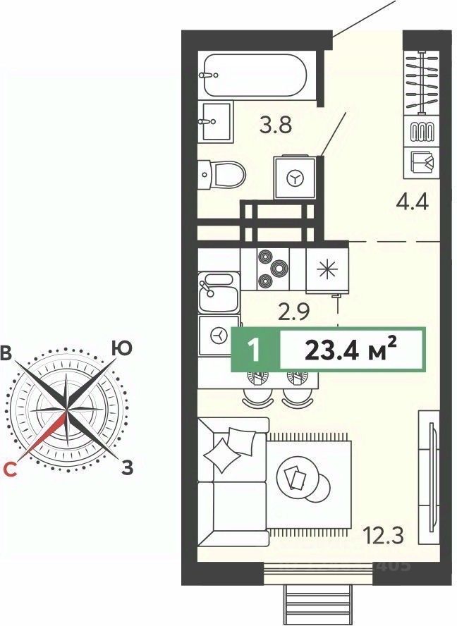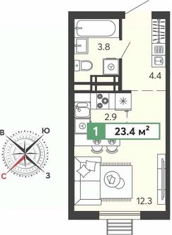 Однокомнатная квартира-студия от застройщика в ЖК "Спутник" на 14 этаже. Квартира без отделки, новый владелец может сделать ремонт по своему проекту. Общая площадь: 23.4 кв.м., площадь гостиной 15.2 кв.м., из которых 2.9 кв.м. выделено под кухонную зону. Все окна выходят на одну сторону. В квартире один совмещенный санузел. Высота потолков 2.68 м.