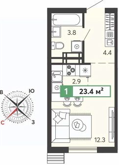 1-комн. квартира-студия в ЖК "Спутник" на 1 этаже. Квартира без отделки, после выдачи ключей можно делать ремонт. Общая площадь: 23.4 кв.м., площадь гостиной 15.2 кв.м., из которых 2.9 кв.м. выделено под кухонную зону. Все окна выходят на одну сторону. В квартире один совмещенный санузел. Высота потолков 2.68 м.