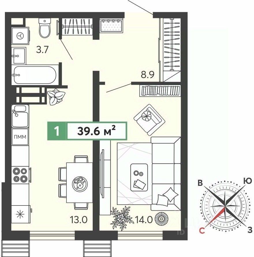 Продается 1-комн. квартира от застройщика в ЖК "Спутник" на 1 этаже. Квартира без отделки, новый владелец может сделать ремонт по своему проекту. Общая площадь: 39.6 кв.м., жилая: 14 кв.м., площадь просторной кухни-столовой: 13 кв.м. Все окна выходят на одну сторону. В квартире один совмещенный санузел. Высота потолков 2.68 м.