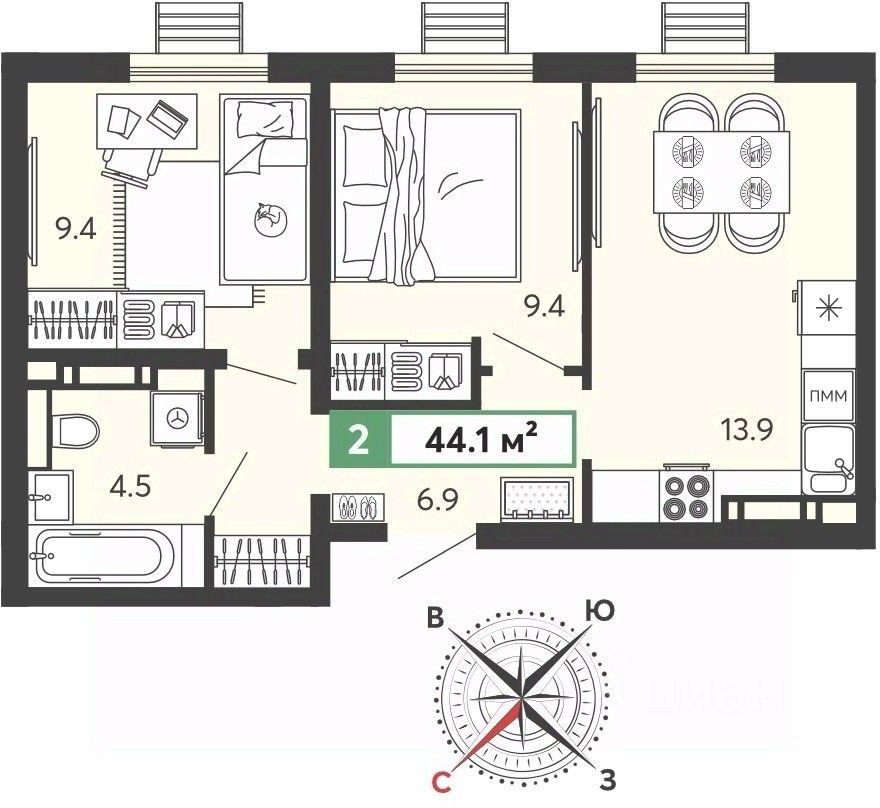 Двухкомнатная квартира от застройщика в ЖК "Спутник" на 3 этаже. Квартира без отделки, новый владелец может сделать ремонт по своему дизайн-проекту. Общая площадь: 44.1 кв.м., жилая: 18.8 кв.м., площадь просторной кухни-столовой: 13.9 кв.м. Комнаты изолированные, все окна выходят на одну сторону. В квартире один совмещенный санузел. Высота потолков 2.68 м.