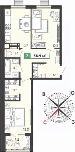 Просторная двухкомнатная квартира в ЖК "Спутник" на 3 этаже. Квартира без отделки, новый владелец может сделать ремонт по своему проекту. Общая площадь: 58.9 кв.м., жилая: 24.3 кв.м., площадь просторной кухни-столовой: 10.7 кв.м. Квартира - распашонка, без проходных комнат, окна выходят на paзные стороны дома. В квартире одна лоджия, один раздельный санузел. Высота потолков 2.68 м.