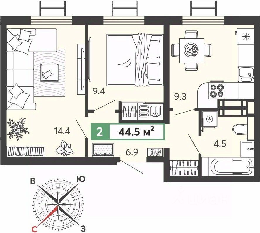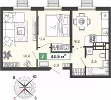 Просторная двухкомнатная квартира в ЖК "Спутник" на 4 этаже. Квартира без отделки, полностью готова к ремонту. Общая площадь: 44.5 кв.м., жилая: 23.8 кв.м., площадь просторной кухни-столовой: 9.3 кв.м. Комнаты изолированные, все окна выходят на одну сторону. В квартире один совмещенный санузел. Высота потолков 2.68 м.