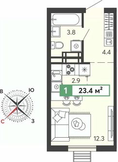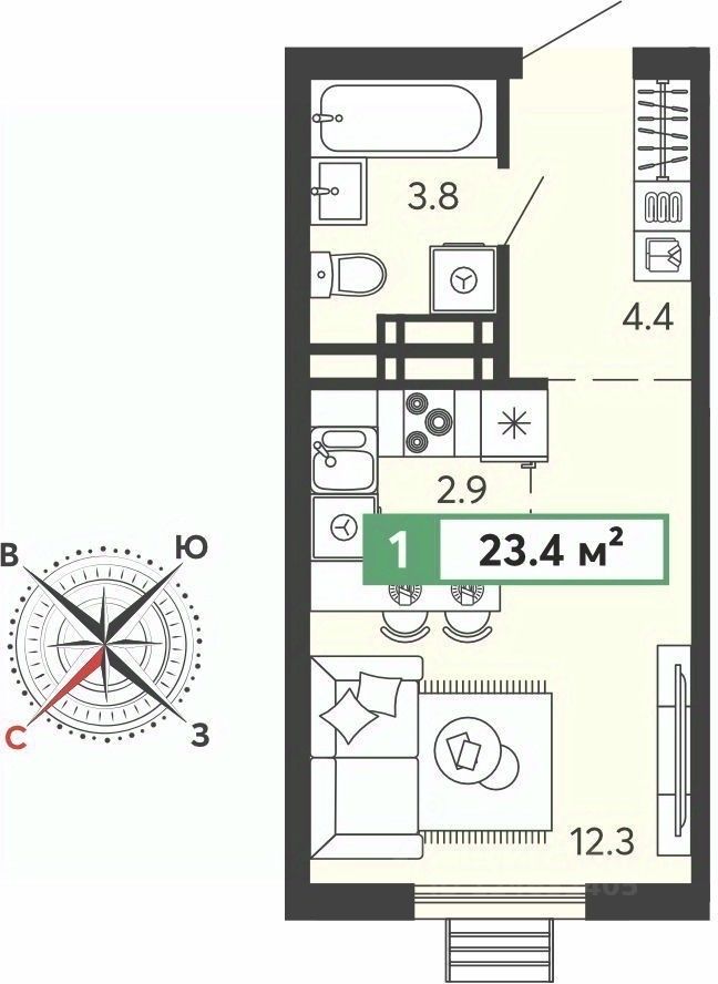 Просторная 1-комн. квартира-студия в ЖК "Спутник" на 6 этаже. Квартира без отделки, полностью готова к чистовой отделке и дальнейшему ремонту. Общая площадь: 23.4 кв.м., площадь гостиной 15.2 кв.м., из которых 2.9 кв.м. выделено под кухонную зону. Все окна выходят на одну сторону. В квартире один совмещенный санузел. Высота потолков 2.68 м.