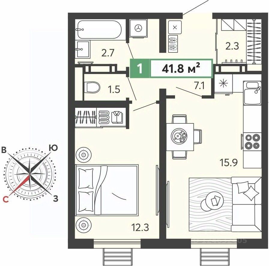 Однокомнатная квартира от застройщика в ЖК "Спутник" на 6 этаже. Квартира без отделки, после получения ключей можно делать ремонт. Общая площадь: 41.8 кв.м., жилая: 12.3 кв.м., площадь просторной кухни-столовой: 15.9 кв.м. Все окна выходят на одну сторону. В квартире один раздельный санузел. Высота потолков 2.68 м.