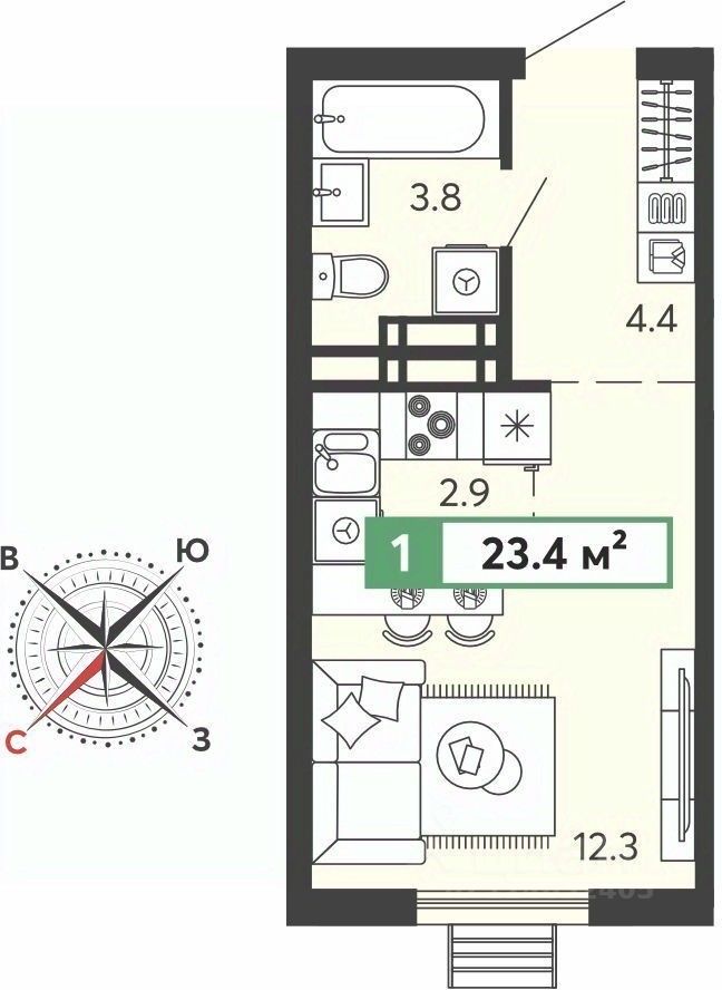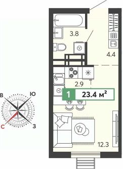Продается однокомнатная квартира-студия в ЖК "Спутник" на 8 этаже. Квартира без отделки, новый владелец может сделать ремонт по индивидуальному проекту. Общая площадь: 23.4 кв.м., площадь гостиной 15.2 кв.м., из которых 2.9 кв.м. выделено под кухонную зону. Все окна выходят на одну сторону. В квартире один совмещенный санузел. Высота потолков 2.68 м.