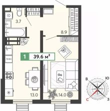 Однокомнатная квартира в ЖК "Спутник" на 9 этаже. Квартира без отделки, новый собственник может сделать ремонт по индивидуальному проекту. Общая площадь: 39.6 кв.м., жилая: 14 кв.м., площадь просторной кухни-столовой: 13 кв.м. Все окна выходят на одну сторону. В квартире один совмещенный санузел. Высота потолков 2.68 м.