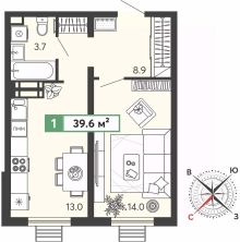 Продается 1-комн. квартира в ЖК "Спутник" на 10 этаже. Квартира без отделки, после выдачи ключей можно делать ремонт. Общая площадь: 39.6 кв.м., жилая: 14 кв.м., площадь просторной кухни-столовой: 13 кв.м. Все окна выходят на одну сторону. В квартире один совмещенный санузел. Высота потолков 2.68 м.