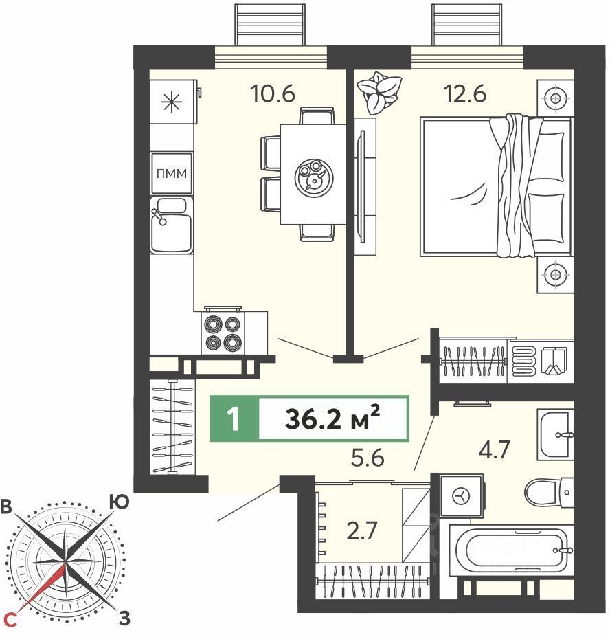 1-комн. квартира в ЖК "Спутник" на 12 этаже. Квартира без отделки, после оформления собственности можно делать ремонт. Общая площадь: 36.2 кв.м., жилая: 12.6 кв.м., площадь просторной кухни-столовой: 10.6 кв.м. Все окна выходят на одну сторону. В квартире один совмещенный санузел. Высота потолков 2.68 м.