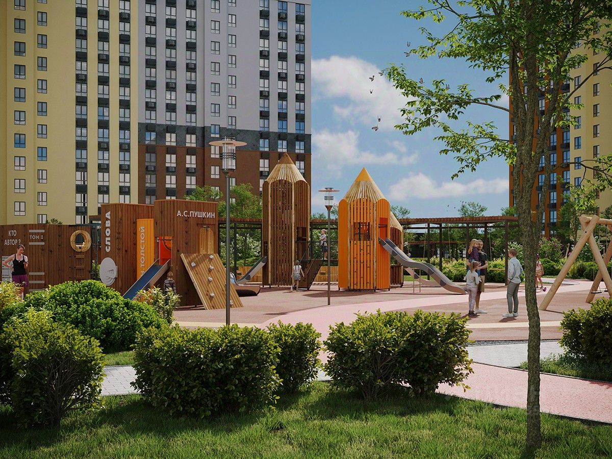 Концепция "дворов-парков" без машин с озеленением, игровыми и спортивными зонами (площадки, воркаут), велодорожками. В подъездах — вход с уровня земли, мягкие зоны ожидания и стеллажи для книгообмена.