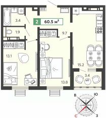 Просторная двухкомнатная квартира в ЖК "Спутник" на 12 этаже. Квартира без отделки, после оформления собственности можно делать ремонт. Общая площадь: 60.5 кв.м., жилая: 26.9 кв.м., площадь просторной кухни-столовой: 15.2 кв.м. Комнаты изолированные, все окна выходят на одну сторону. В квартире одна лоджия, один раздельный санузел. Высота потолков 2.68 м.