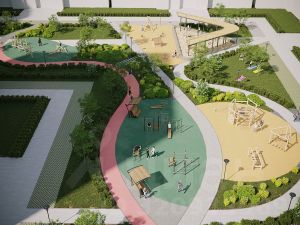 Концепция "дворов-парков" без машин с озеленением, игровыми и спортивными зонами (площадки, воркаут), велодорожками. В подъездах — вход с уровня земли, мягкие зоны ожидания и стеллажи для книгообмена.
