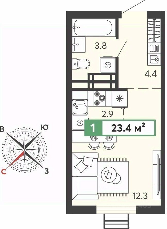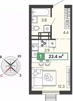 Просторная 1-комн. квартира-студия в ЖК "Спутник" на 13 этаже. Квартира без отделки, после выдачи ключей можно делать ремонт. Общая площадь: 23.4 кв.м., площадь гостиной 15.2 кв.м., из которых 2.9 кв.м. выделено под кухонную зону. Все окна выходят на одну сторону. В квартире один совмещенный санузел. Высота потолков 2.68 м.