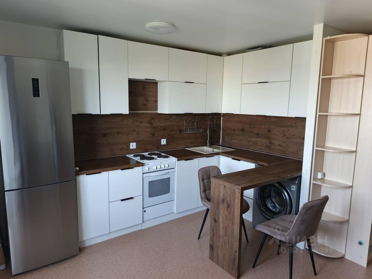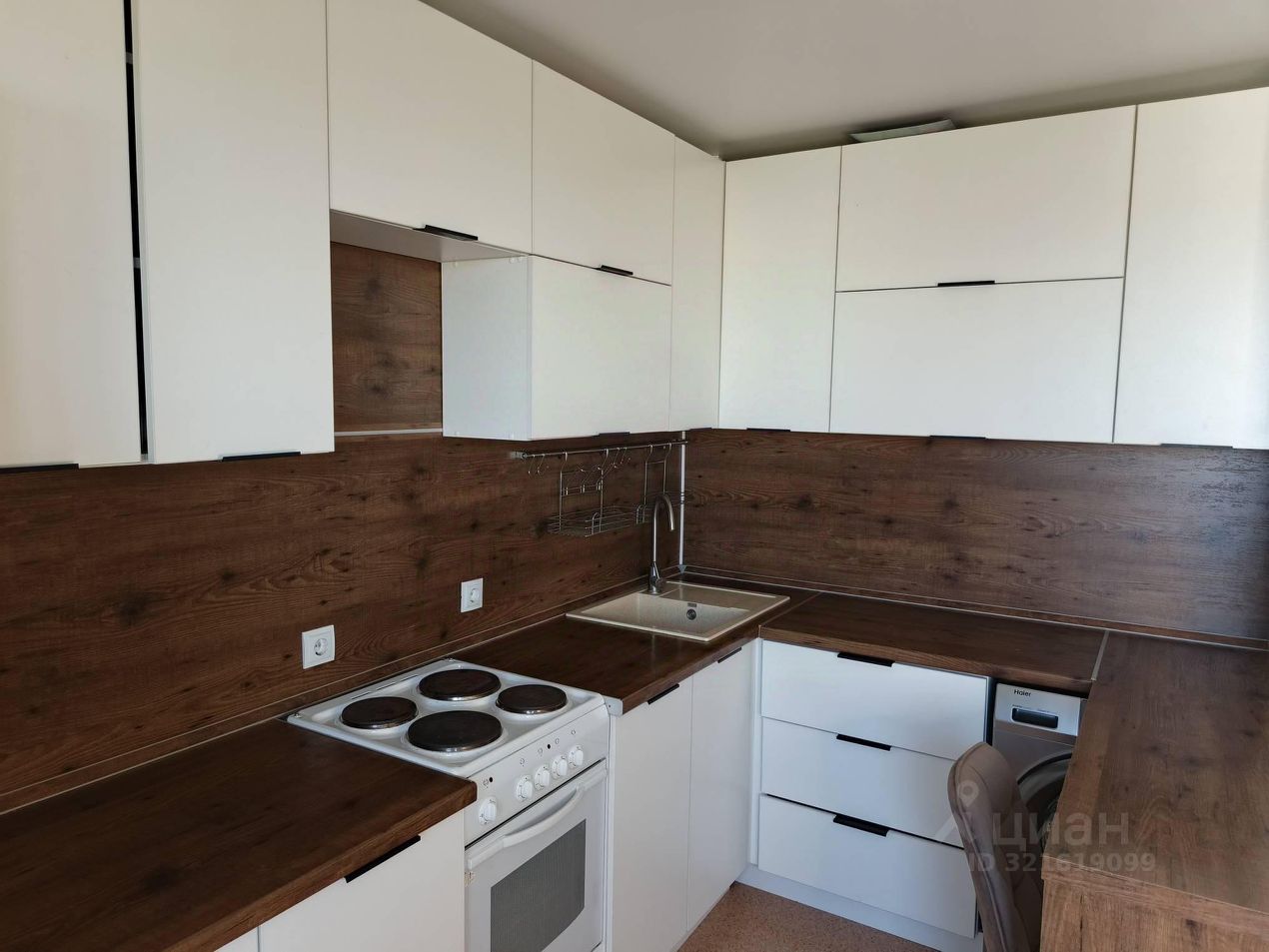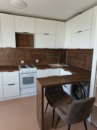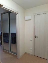 Квартира продается с предметами бытовой техники и мебели: кухонный гарнитур, стулья современного дизайна, электрическая плита, раковина, смеситель, большой диван, встроенный шкаф-купе с зеркальными створками, мебель в коридоре.