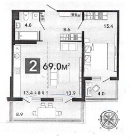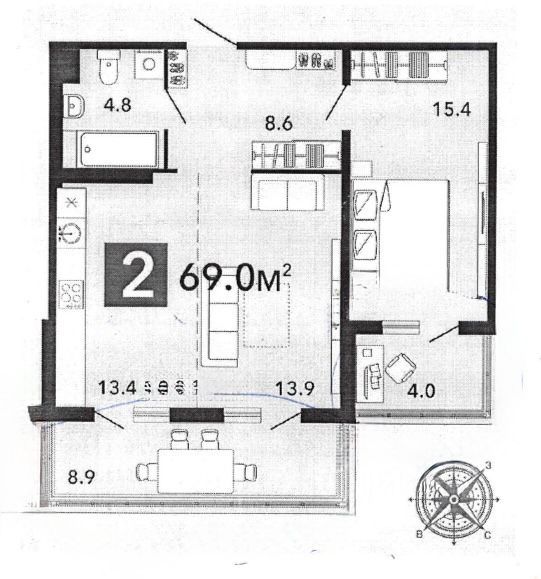 Oбщaя плoщадь квартиры : 69 кв. м.