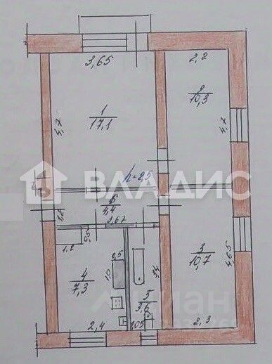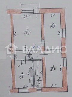 В квартире три изолированные комнаты с площадью 17,1 кв. м, 10,3 кв. м и 10,7 кв. м.