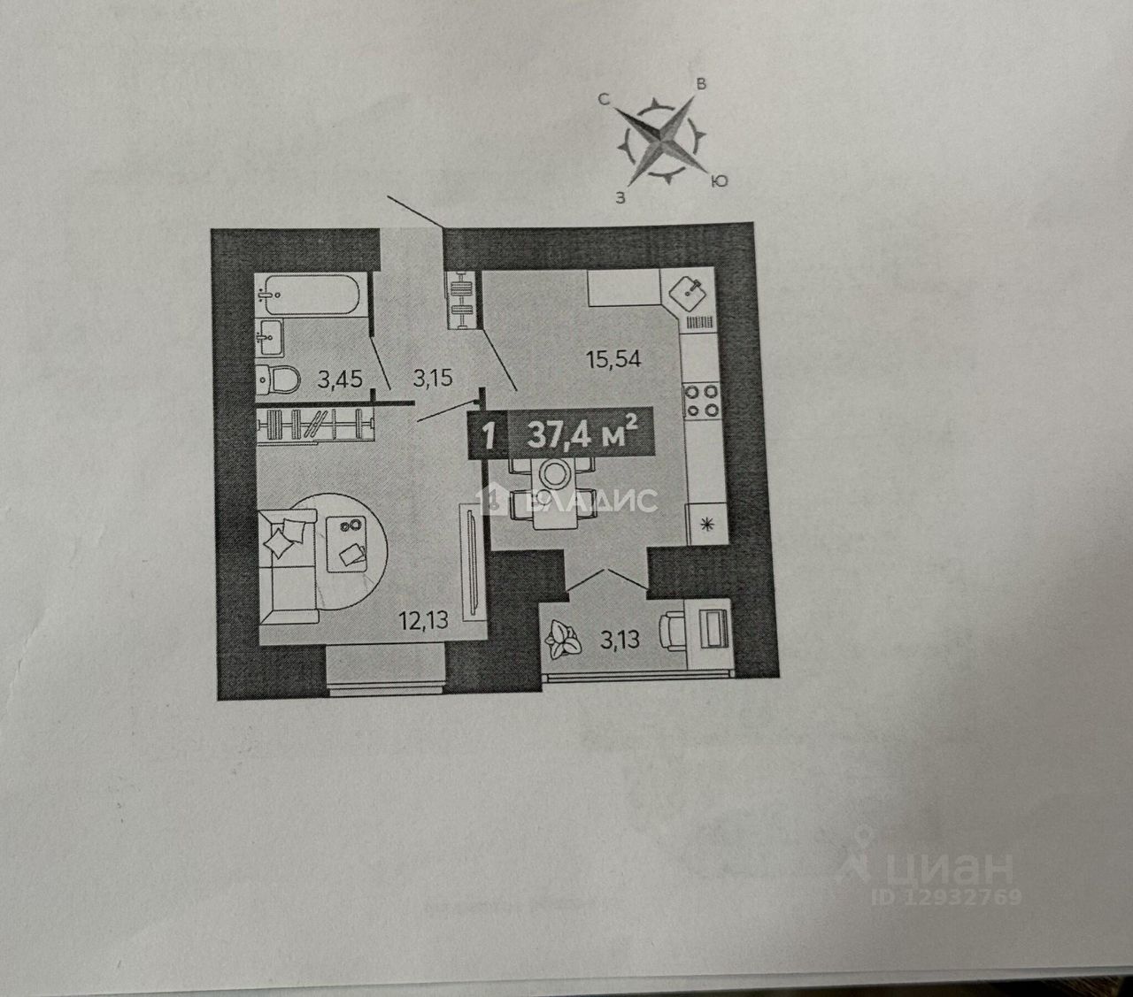 Общая площадь -37,4 кв. м.
