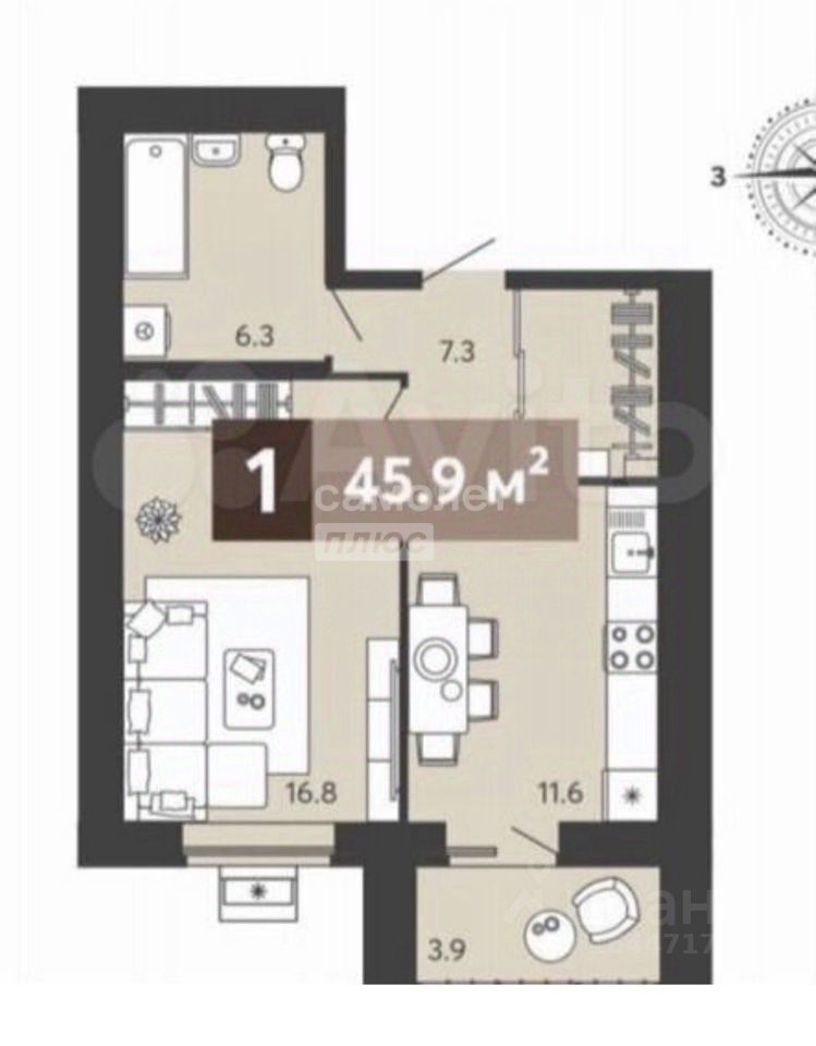 Общая площадь 45,9 кв.м.