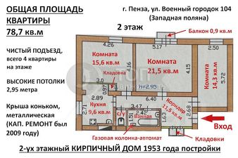 КРЕПКИЙ КИРПИЧ. ДОМ СТАЛИНСКОЙ постройки! На этаже всего 4 квартиры, в доме 8 квартир! ЧИСТЫЙ подъезд! Крыша коньком, метал. (НЕ течёт, КАП. РЕМОНТ был в 2009г). ВЫСОКИЕ потолки 2,95м! Горяч. вода через газ. колонку выходит ГОРАЗДО ДЕШЕВЛЕ, чем без колонки, и горяч. вода есть всегда!