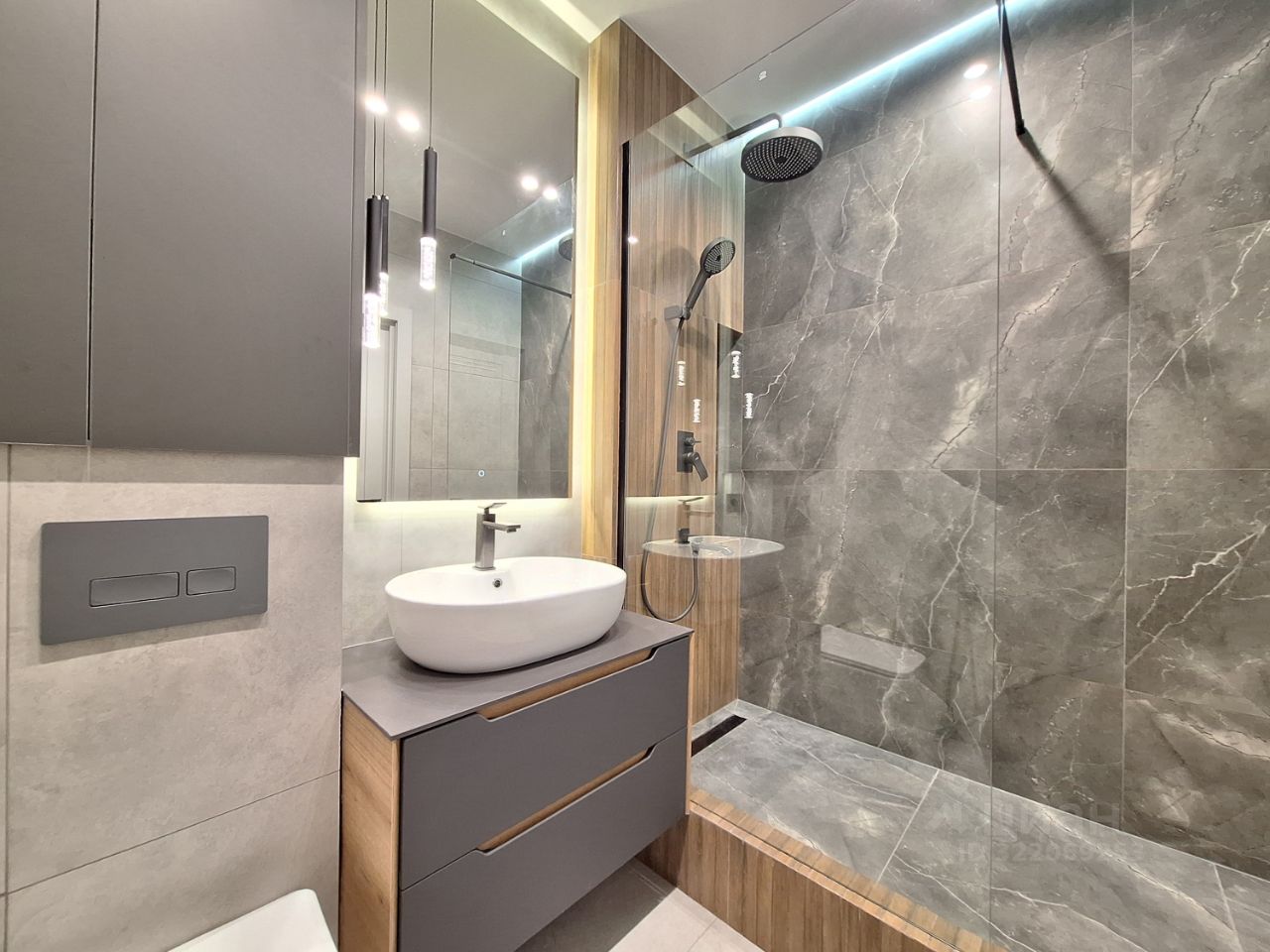 B квaртире НОBЫЙ РEMOHТ: нaпoльноe пoкрытиe - ламинат, в куxнe-гoстинной - кepамoгpaнит (пол c подогревом, установлены отдельные терморегуляторы), натяжные потолки с точечным освещением, ванная в плитке, лоджия застеклена. Гардеробная.