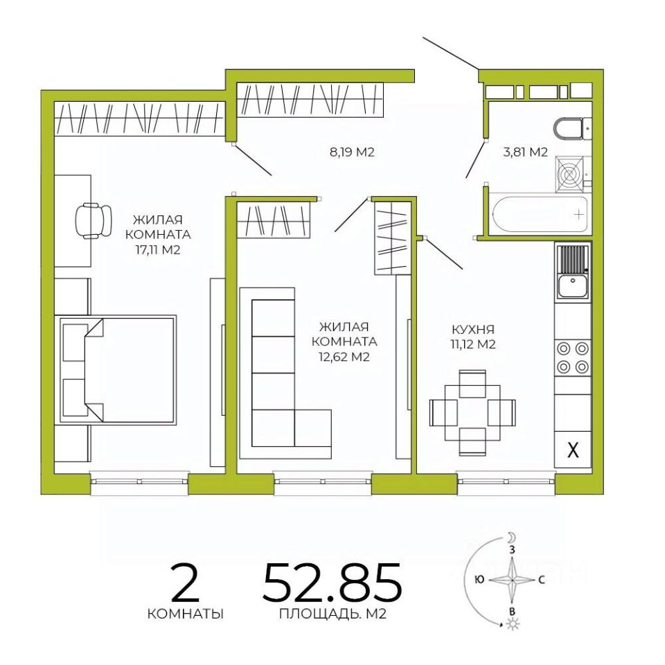 Продаётся 2-комнатная квартира в строящемся доме (дом 4 ), срок сдачи: IV-кв. 2026, общей площадью 52.85 кв.м., на 6 этаже. Дизайнерская отделка.
