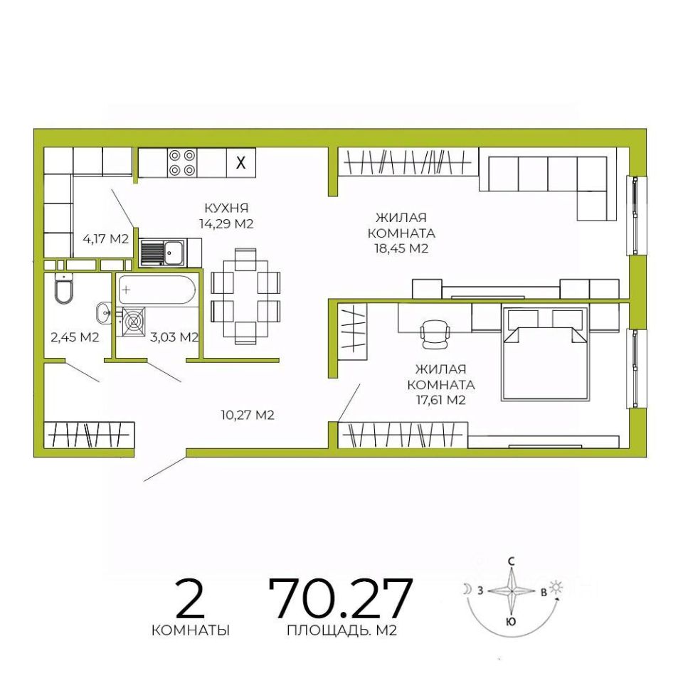 Продаётся 2-комнатная квартира в строящемся доме (дом 4 ), срок сдачи: IV-кв. 2026, общей площадью 70.27 кв.м., на 11 этаже. Дизайнерская отделка.