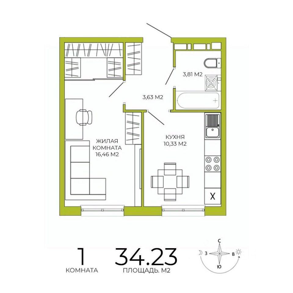 Продаётся 1-комнатная квартира в строящемся доме (дом 4 ), срок сдачи: IV-кв. 2026, общей площадью 34.23 кв.м., на 14 этаже. Дизайнерская отделка.