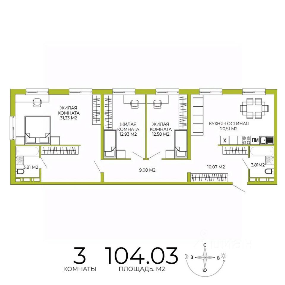 Продаётся 3-комнатная квартира в строящемся доме (дом 4 ), срок сдачи: IV-кв. 2026, общей площадью 104.03 кв.м., на 2 этаже. Дизайнерская отделка.