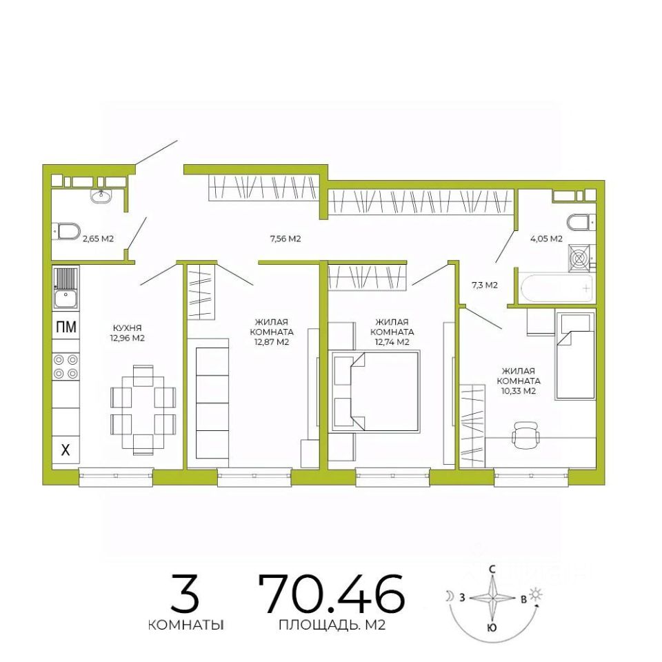 Продаётся 3-комнатная квартира в строящемся доме (дом 4 ), срок сдачи: IV-кв. 2026, общей площадью 70.46 кв.м., на 8 этаже. Дизайнерская отделка.